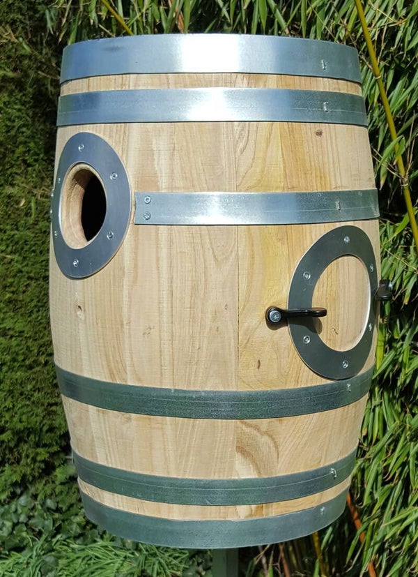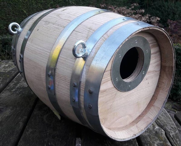 Dit 30 liter broedvat van kastanjehout is compact, stevig en staat mooi in de volière.